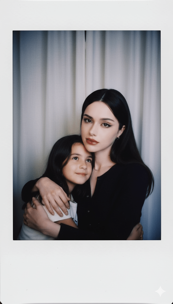 Take a photo taken with a Polaroid camera. The photo should look like an ordinary photograph, without an explicit subject or property. The photo should have a slight blur and a consistent light source, like a flash from a dark room, scattered throughout the photo. Don’t change the face. Change the background behind those two people with white curtains. Make it look like both people in the reference picture are hugging each other.